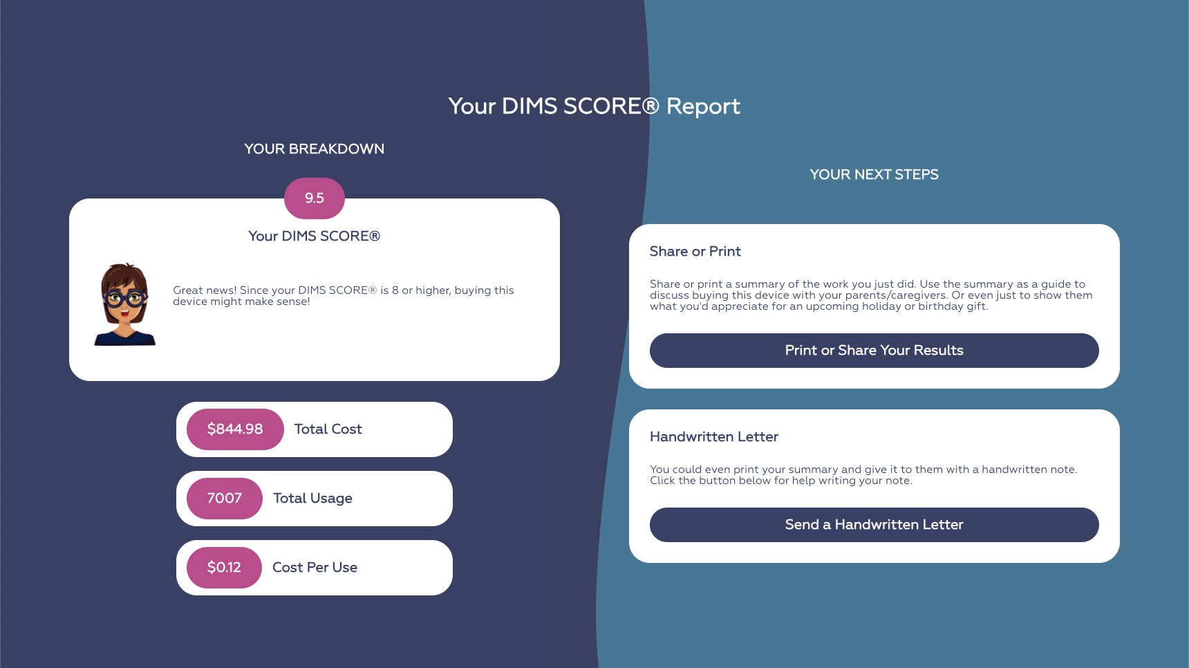 The shareable DIMS SCORE® report students can generate illustrates all the numbers and thinking young people have gone through when considering a possible purchase. It was designed to serve as the agenda for a relaxed, productive conversation about spending, around the kitchen table, or in a classroom. When families sit down to discuss the report, they know exactly how much the young person in their life is asking them to spend. We aim to ensure that the amount shown is as representative and complete as possible. But the decision about whether that amount of money makes sense for your family is yours alone, as it should be.